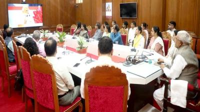 भोपाल : प्रधानमंत्री नरेन्द्र मोदी द्वारा राष्ट्रीय गीत वंदे मातरम् के 150 वें वर्ष स्मरणोत्सव समारोह का शुभारंभ शुक्रवार को किया। दिल्ली के इंदिरा गांधी इंडोर स्टेडियम में आयोजित कार्यक्रम में राज्यपाल मंगुभाई पटेल भोपाल राजभवन से वर्चुअली शामिल हुए। इस अवसर पर राज्यपाल के प्रमुख सचिव डॉ. नवनीत मोहन कोठारी, अपर सचिव उमाशंकर भार्गव, जनजातीय प्रकोष्ठ की सचिव मीनाक्षी सिंह सहित राजभवन के अधिकारी उपस्थित थे।
