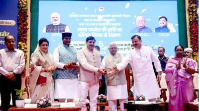 भोपाल : राज्यपाल मंगुभाई पटेल और मुख्यमंत्री डॉ. मोहन यादव ने शिक्षक दिवस पर उत्कृष्ट कार्य करने वाले शिक्षकों को सम्मानित किया। साथ ही शासकीय विद्यालयों में कक्षा एक से 8 तक के 55 लाख विद्यार्थियों के खातों में शाला गणवेश की 330 करोड़ की राशि अंतरित की। आर.सी.व्ही.पी नरोन्हा प्रशासन एवं प्रबंधकीय अकादमी भोपाल में आयोजित राज्य स्तरीय शिक्षक सम्मान समारोह में मुख्यमंत्री डॉ. यादव ने शैक्षणिक संवर्ग के सहायक शिक्षक, उच्च श्रेणी तथा नवीन शैक्षणिक संवर्ग के प्राथमिक शिक्षक एवं माध्यमिक शिक्षकों को क्रमोन्नत योजना प्रभावशील होने से चतुर्थ समयमान वेतनमान के लाभ के समरूप चतुर्थ क्रमोन्नत वेतनमान का लाभ दिये जाने की घोषणा की।