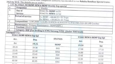 वरिष्ठ मंडल वाणिज्य प्रबंधक श्री सौरभ कटारिया ने बताया कि यह गाड़ी एक ट्रिप के लिए 08 अगस्त 2025 को रानी कमलापति से तथा 09 अगस्त 2025 को रीवा से चलाई जाएगी।