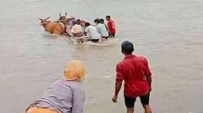 उफनती नदी में बैलगाड़ी बनी एकमात्र सहारा