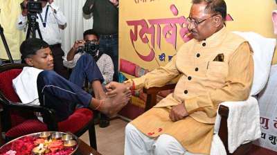 हाथ नहीं, पैरों से मुख्यमंत्री साय को वर्षा ने बांधी राखी