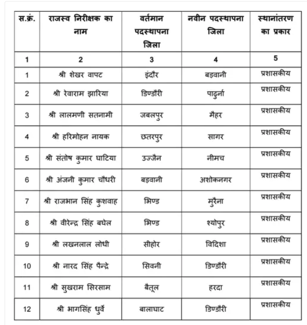 मध्य प्रदेश में मंगलवार को राजस्व विभाग ने बड़ा आदेश जारी किया है. प्रदेश के 119 राजस्व निरीक्षक प्रभारी नायब तहसीलदार बनाए गए हैं. इन सभी प्रभारी नायब तहसीलदार की नए जिलों में पोस्टिंग की गई है. राजस्व विभाग ने आदेश जारी करते हुए सभी से तत्काल प्रभाव से नए जिले में पोस्ट होने के लिए कहा है.