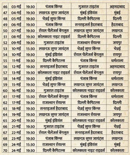 दूसरे चरण में आठ डबल हेडर मुकाबले होंगे जिसमें दोपहर के मैच भारतीय समयानुसार 3:30 बजे से होंगे, जबकि शाम के मैच 7:30 बजे से खेले जाएंगे। पहले चरण में चार डबल हेडर होने हैं। यानी इस बार कुल 12 डबल हेडर मुकाबले खेले जाएंगे। पंजाब किंग्स की टीम अपने होम मुकाबले न्यू चंडीगढ़ और धर्मशाला में खेलेगी। इस दौरान धर्मशाला में तीन मैच खेले जाएंगे। दूसरी तरफ, राजस्थान की टीम चार मैच जयपुर में खेलेगी, जबकि गत चैंपियन रॉयल चैलेंजर्स बेंगलुरु (आरसीबी) अपने तीन होम मैच बंगलूरू और दो रायपुर में खेलेगी। बीसीसीआई ने बताया कि प्लेऑफ के वेन्यू की घोषणा बाद में की जाएगी।