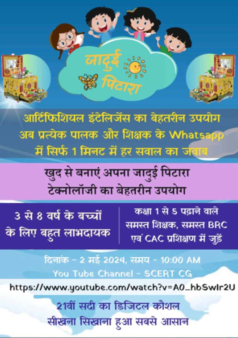 रायपुर। आगामी शिक्षण सत्र 16 जून 2024 से छत्तीसगढ़ के तीन से आठ वर्ष की आयु के सभी बच्चों अर्थात् बालबाड़ी तथा कक्षा 1 व 2 में ‘जादुई पिटारा’ के माध्यम से पढ़ाई-लिखाई कराने की कार्ययोजना और रणनीति बनायी जा रही है ।
