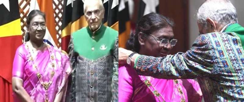 राष्ट्रपति द्रौपदी मुर्मू को सार्वजनिक सेवा में उनकी उपलब्धियों और शिक्षा, सामाजिक समर्पण के लिए तिमोर-लेस्ते के राष्ट्रपति जोस रामोस-होर्टा द्वारा देश के सर्वोच्च नागरिक पुरस्कार 'ग्रैंड कॉलर ऑफ द ऑर्डर ऑफ तिमोर-लेस्ते' से सम्मानित किया गया.