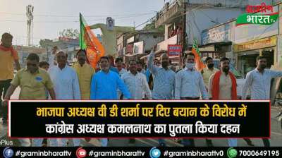 भाजपा अध्यक्ष वी डी शर्मा पर दिए बयान के विरोध में कांग्रेस अध्यक्ष कमलनाथ का पुतला किया दहन