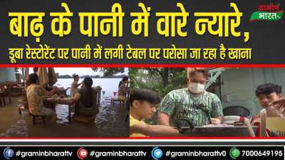 बाढ़ के पानी में वारे न्यारे, डूबा रेस्टोरेंट पर पानी में लगी टेबल पर परोसा जा रहा है खाना