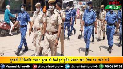मुंगावली में त्रिस्तरीय पंचायत चुनाव को देखते हुए पुलिस प्रशासन द्वारा किया गया फ्लैग मार्च