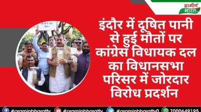 इंदौर में दूषित पानी से हुई मौतों पर कांग्रेस विधायक दल का विधानसभा परिसर में जोरदार विरोध प्रदर्शन